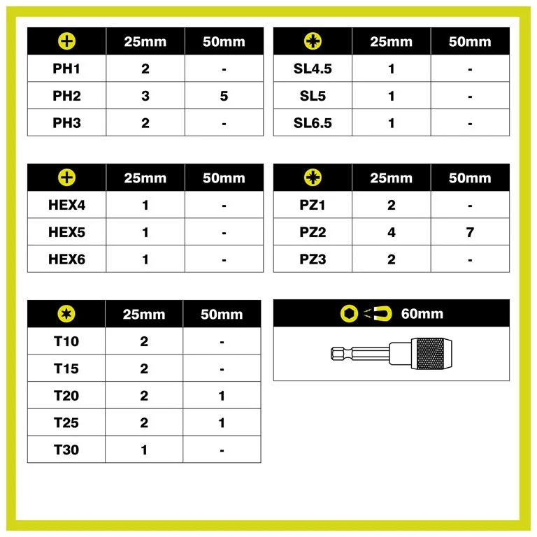 A RYOBI® RX nagy teljesítményű tartozékkínálatának részeként az RX ütvecsavarozó bitek kifejezetten nagy nyomatékú és erősen igénybe vett feladatokra lettek tervezve. Akár 10x hosszabb élettartamot biztosítanak a RYOBI® alap csavarozó bitkészletéhez képest. Ütésálló anyagból készültek, beépített rezgéscsillapító zónával, amely csökkenti az ütődések okozta károsodást, és meghosszabbítja a bitek élettartamát. A precíziós hegyek pontos illeszkedést garantálnak, mérséklik a kicsúszás és a kopás esélyét. A fekete-oxid bevonat pedig kiemelkedő korrózióvédelmet nyújt. Úgy lettek megalkotva, hogy minden projekt során csúcsteljesítményt nyújtsanak, így megbízható megoldást jelentenek bármilyen kihívást jelentő feladathoz.